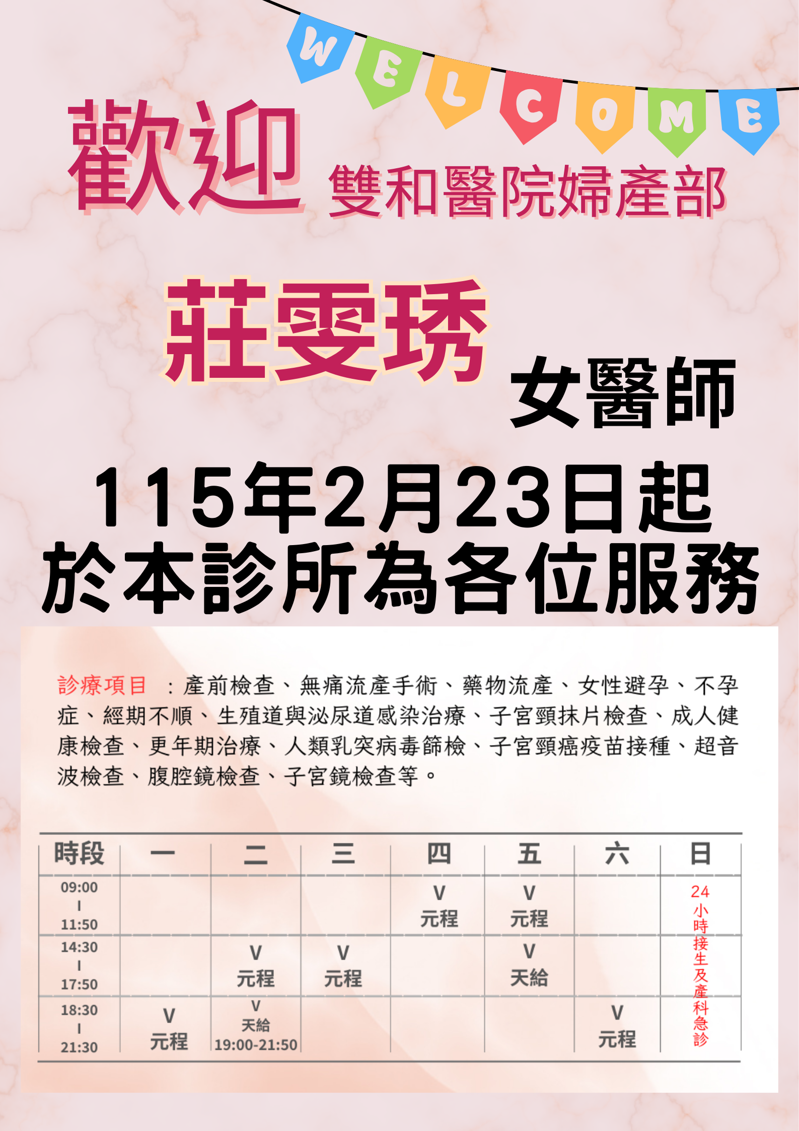 歡迎~「莊雯琇」女醫師 115年2月23日起 於本診所為各位服務 💜💜💜