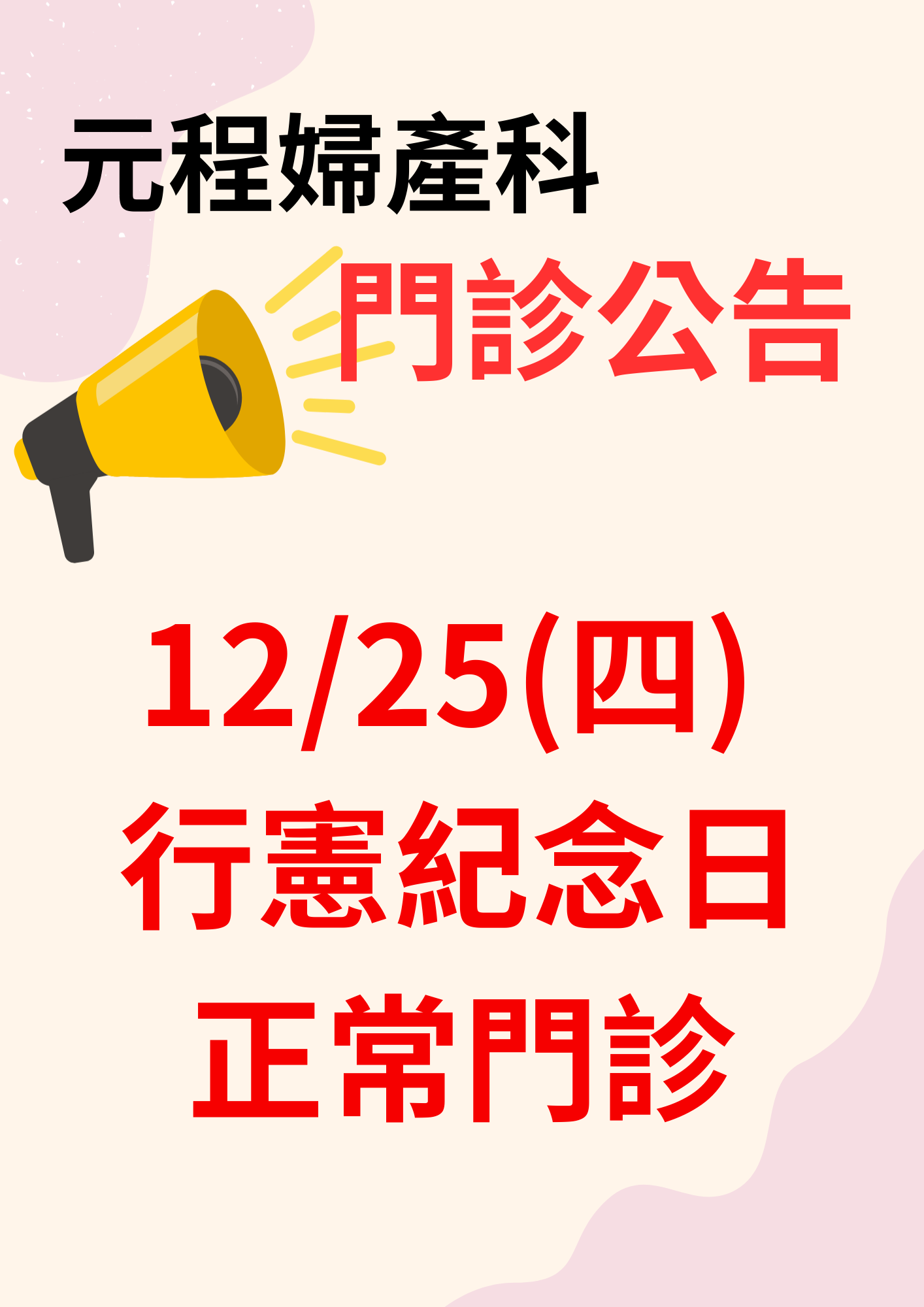 【元程】12/25(四) 行憲紀念日 門診公告
